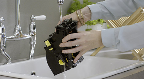 Reizi nedēļā skalojiet uzliešanas mezglu ar remdenu ūdeni. Lai veiktu ikmēneša tīrīšanu ar Philips Saeco attaukošanas tableti CA6704, ievērojiet lietotāja rokasgrāmatā sniegto veicamo darbību aprakstu.