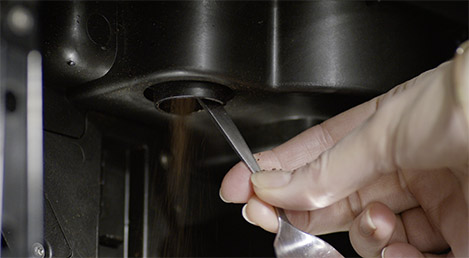 Reizi nedēļā no augšas tīriet kafijas piltuvi ar karotes kātu caur iepriekš samaltās kafijas nodalījumu. Ja ierīcei nav iepriekš samaltās kafijas nodalījuma, iebīdiet karoti no apakšas.